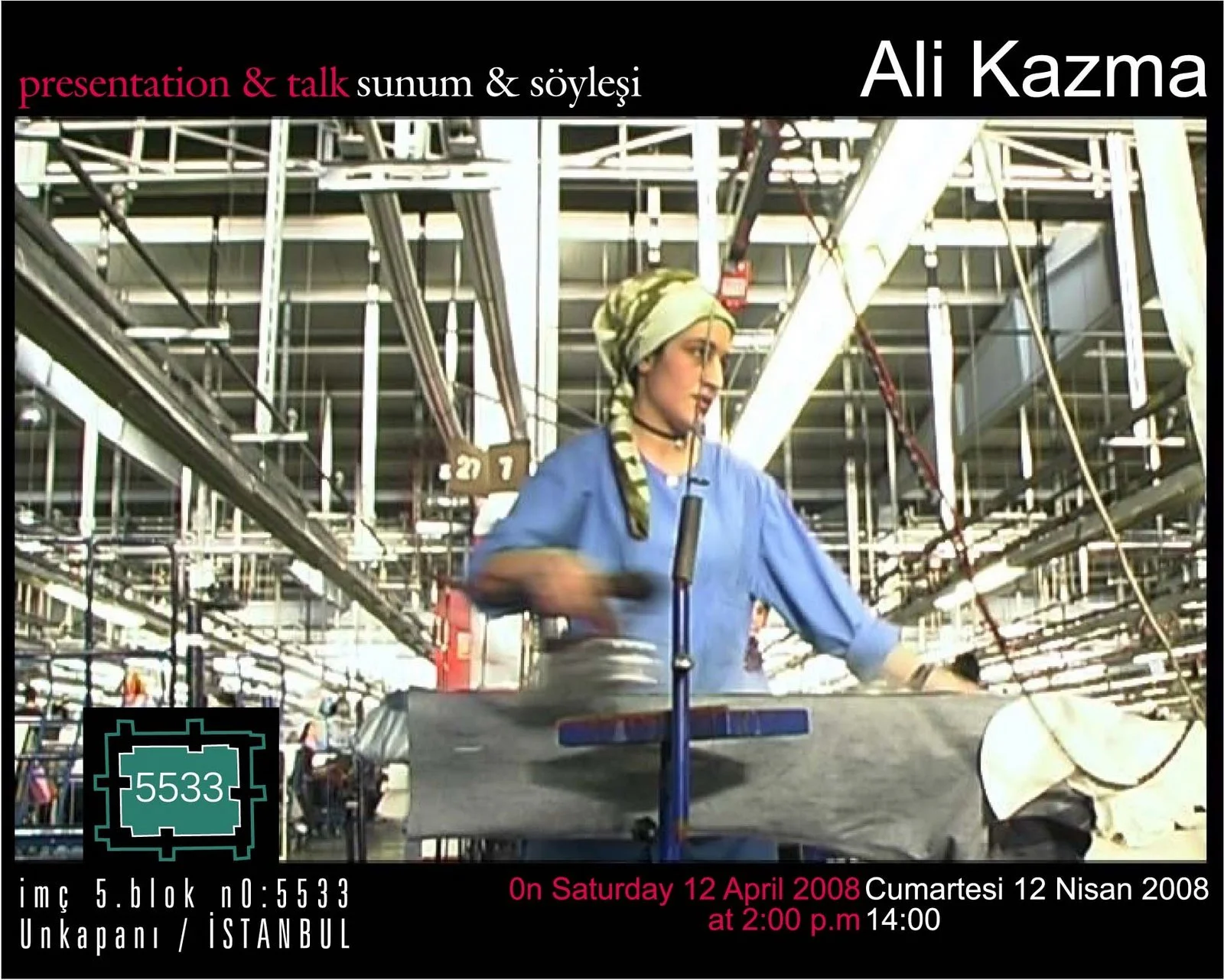 5533 adına sanat mekaninda, Marcus Graf, Volkan Aslan ve Nancy Atakan, 12 Nisan Cumartesi saat 14:00’te sanatçı Ali Kazma’yı ağırlamaktan mutluluk duyar. 10. İstanbul Bienali sırasında da İMÇ’de bulunan Ali Kazma’nın bu mekana geri dönerek yeni projelerinden bahsedecek ve video sunumu yapacak olmasını 5533 olarak anlamlı buluyoruz.