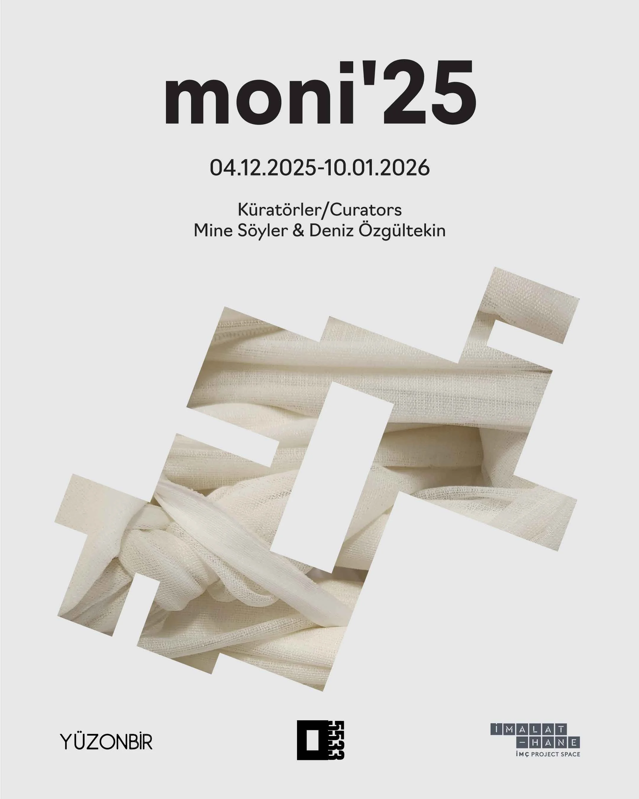 Kabapıynar’dan toplanan kullanılmış kumaşlar ile İMÇ’nin yanı sıra çeşitli üreticilerden alınan biye atıkları serginin temel malzemesini oluşturur. Çarşıda Moni ile yolu kesişen çoğu kişinin eli bu malzemelere değer. Kolektif bir çabayla birbirine örülen işler, söz konusu kişi, zaman ve mekânlar arasında görsel bir bağ kurarak Moni'25 sergisinin üretim ve dolaşım hattına işaret eder.