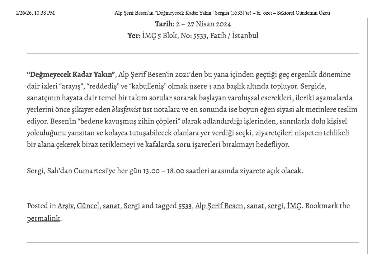 Alp Şerif Besen’in “Değmeyecek Kadar Yakın” Sergisi (5533)’te!, bi-özet, 01.04.2024